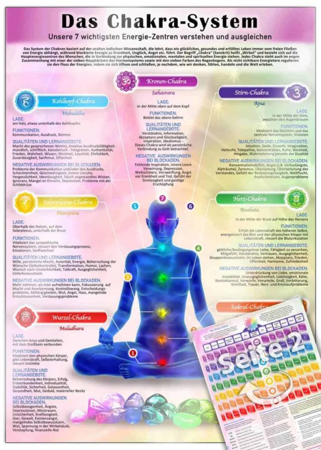 Auf der Vorderseite findest Du zu jedem Chakra: