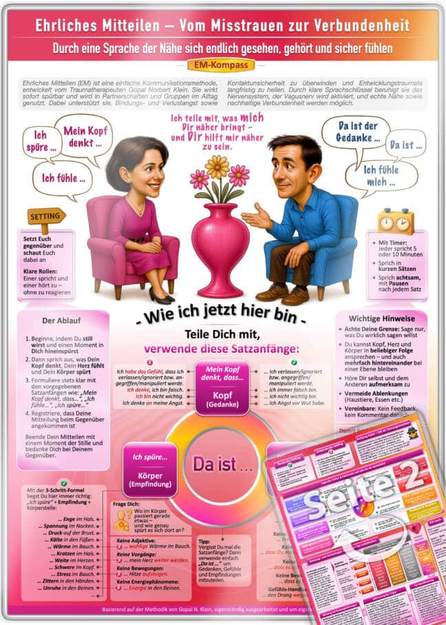 „Ehrliches Mitteilen“ nach Gopal N. Klein stärkt Vertrauen, löst alte Bindungsmuster, beruhigt den Vagusnerv und unterstützt die Traumaheilung. Ob bei Bindungsangst, Verlustangst, Bindungstrauma oder Bindungsstörung – der EM-Kompass zeigt dir, wie du über die Sprache der Nähe wieder echte Verbindung erleben kannst. Dank dem Vagusschlüssel wird dein Nervensystem reguliert, Kommunikation klarer und Beziehung heilsamer. Ideal für Therapeuten, Heilpraktiker, Psychologen, Coaches, Hypnotherapeuten, Psychotherapeuten und Paare.