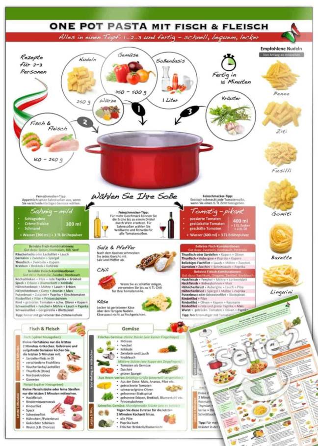 Der moderne Kochberater (DIN-A4, hochwertig laminiert) ersetzt alle anderen Kochbücher für One-Pot-Pasta. Er bietet Dir einen einzigartigen Rezeptbaukasten und eine einfache Anleitung zur schnellen und bequemen Zubereitung herrlicher Nudelgerichte mit Fisch oder Fleisch.