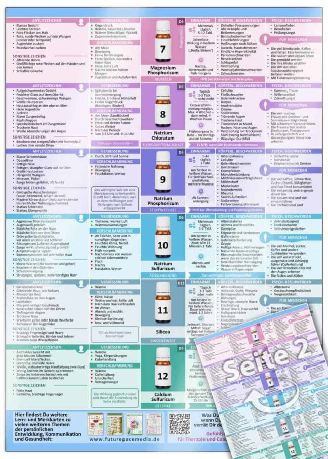 Ob Sie als Heilpraktiker oder Naturheilkundlicher Arzt tätig sind oder sich als Laie selbst homöopathisch behandeln wollen: mit der Schüßler-Salze-Übersichtskarte halten Sie ein kleines, alltagstaugliches Nachschlagwerk in der Hand, welches Ihnen eine bisher noch nicht dagewesene übersichtliche Zusammenfassung der wesentlichen Aspekte über die Schüßler-Salze bietet. Die Fülle der Inhalte haben wir für Sie kompakt und zugleich übersichtlich, sowie optisch ansprechend gestaltet und auf das Wesentliche komprimiert.
